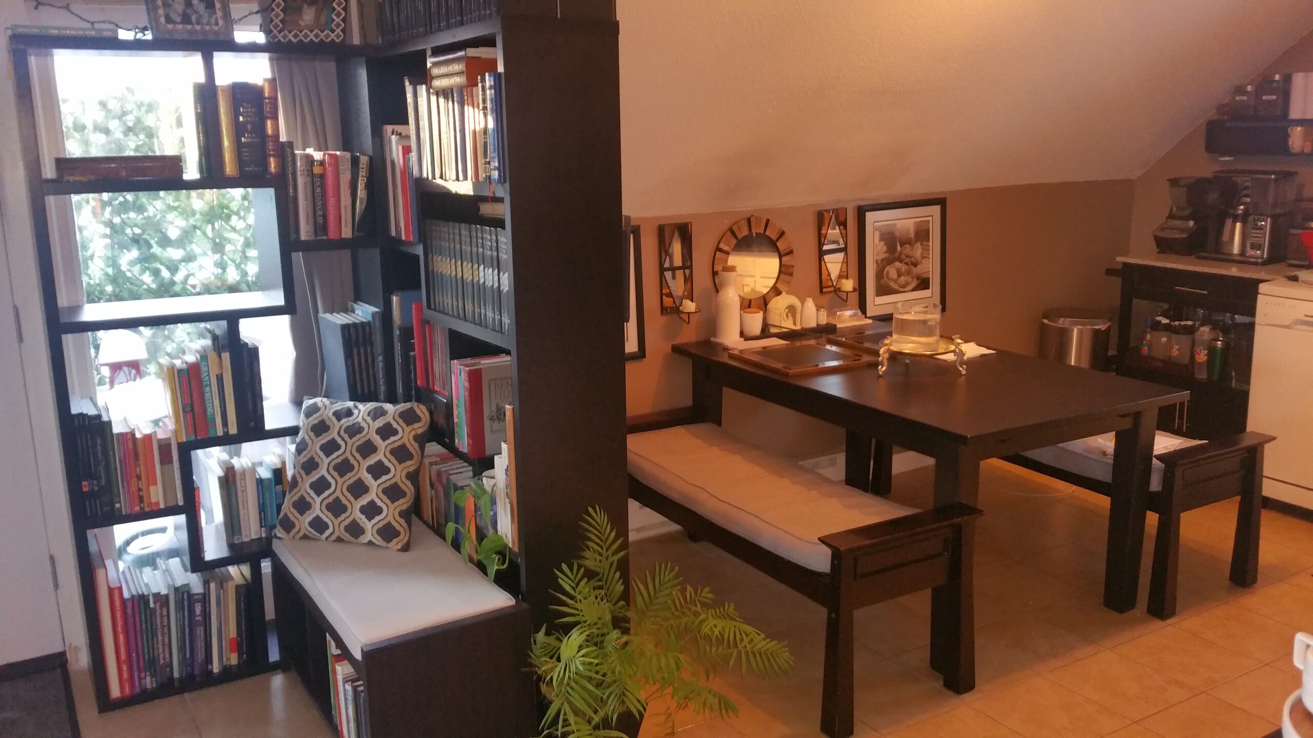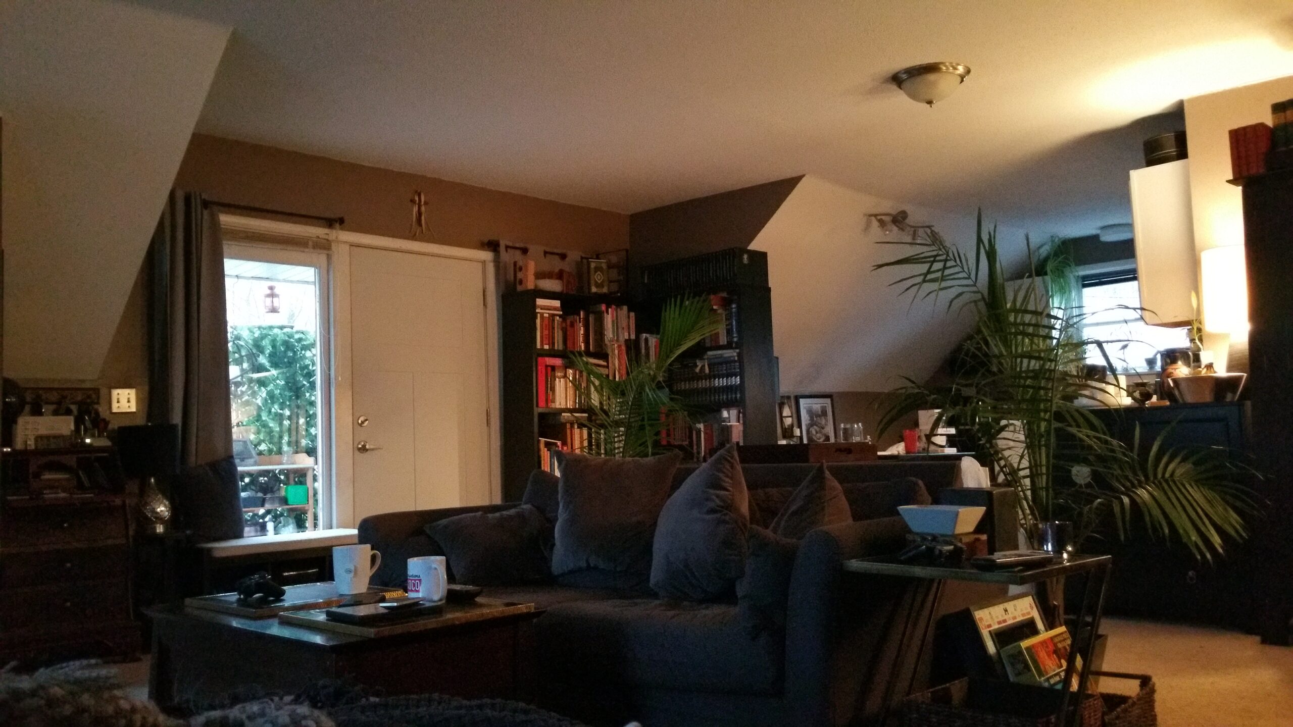 We live comfortably in a luxurious two-bedroom, two-bathroom apartment in a refurbished mill. While we’d prefer to live somewhere more rural, our apartment looks out over a quiet private parking lot to a forested river parcel, which provides additional privacy. The building has remarkable industrial architecture that we enjoy in our apartment, including oversized windows and ledges, 12 ft ceilings, exposed wood boards and support beams, various bolts, pulleys and other industrial devices from when this was a working mill. While we loved our former space, our new space gives us room to breathe and provides (almost) adequate space for our large collection of personal belongings (we prefer to call them treasures).