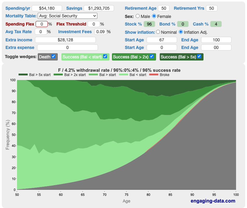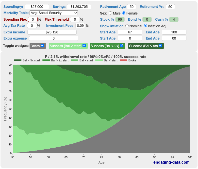 To be clear, I’m not saying they shouldn’t save more / work more / etc. when they feel fine doing so. But I don’t think they need to stress about it. They should have enough, and if they get particularly unlucky with any external factors (inflation, stock market, social security…), they seem like they would have plenty of options to deal with it.